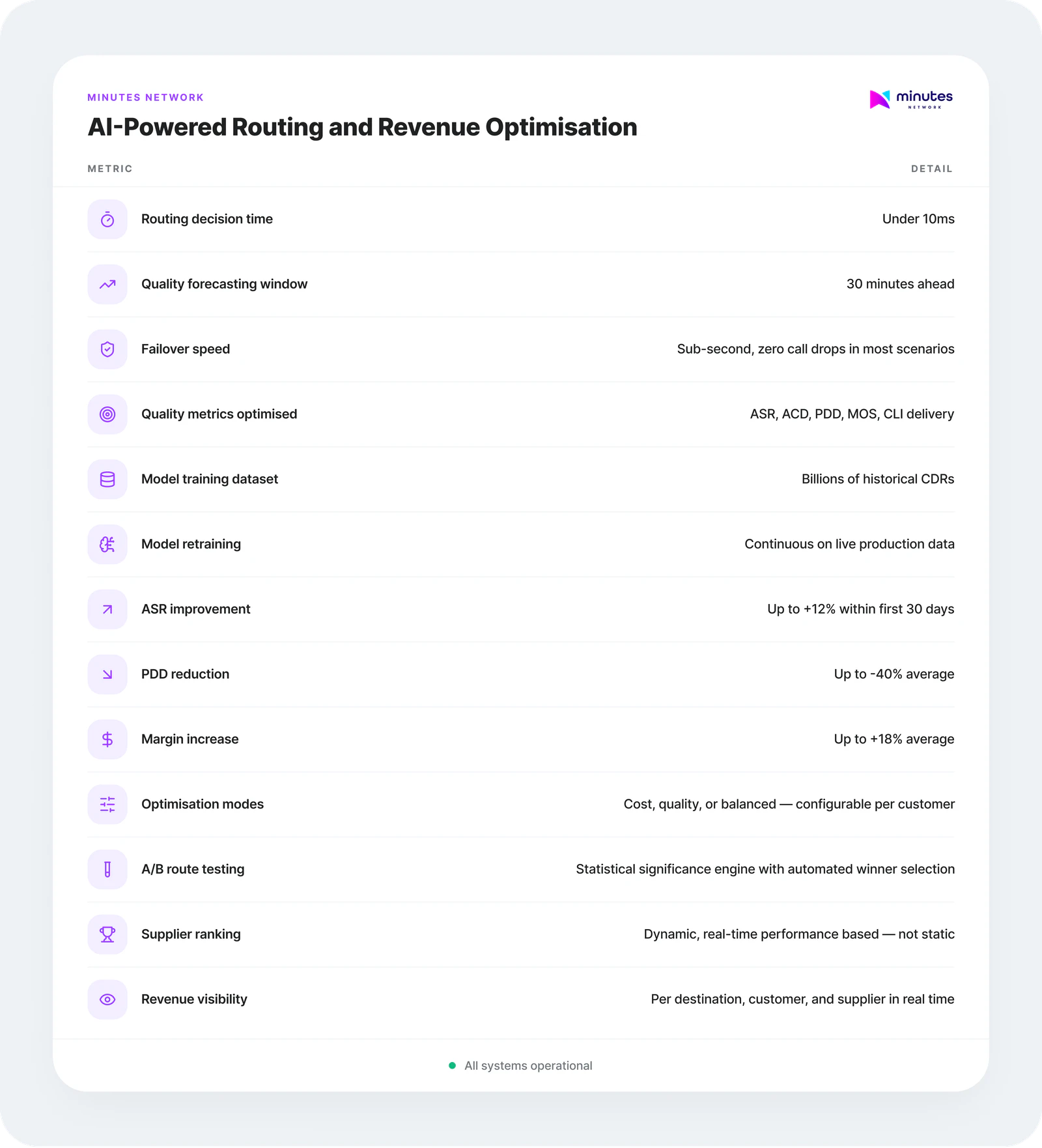 A neural network trained on billions of CDRs spanning years of global traffic data identifies patterns invisible to traditional routing logic, predicting route quality before degradation occurs. Every active route is continuously scored across ASR, ACD, PDD, MOS, and CLI delivery rate in real time. Algorithms balance termination cost against revenue potential, factoring in customer SLAs, quality commitments, and margin targets.