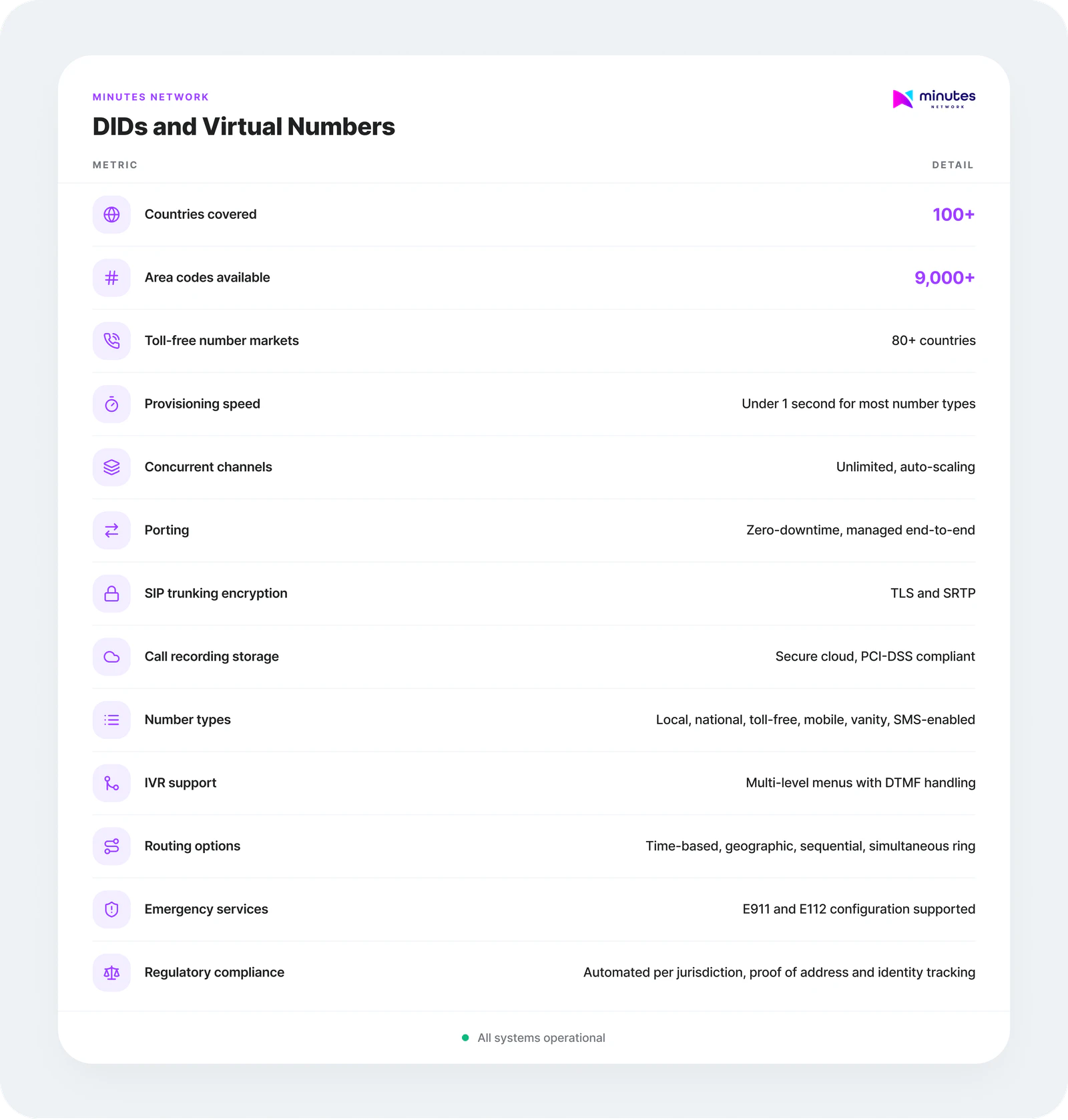 IVR-ready numbers with multi-level menus and DTMF handling. Vanity numbers with pattern matching. Call recording with secure cloud storage and PCI-DSS payment card redaction. SMS-enabled DIDs for two-way messaging. Call forwarding to SIP/PSTN/mobile/voicemail with time-based and geographic routing. Real-time analytics covering call volume, peak hours, caller geography, duration, and answer rates.