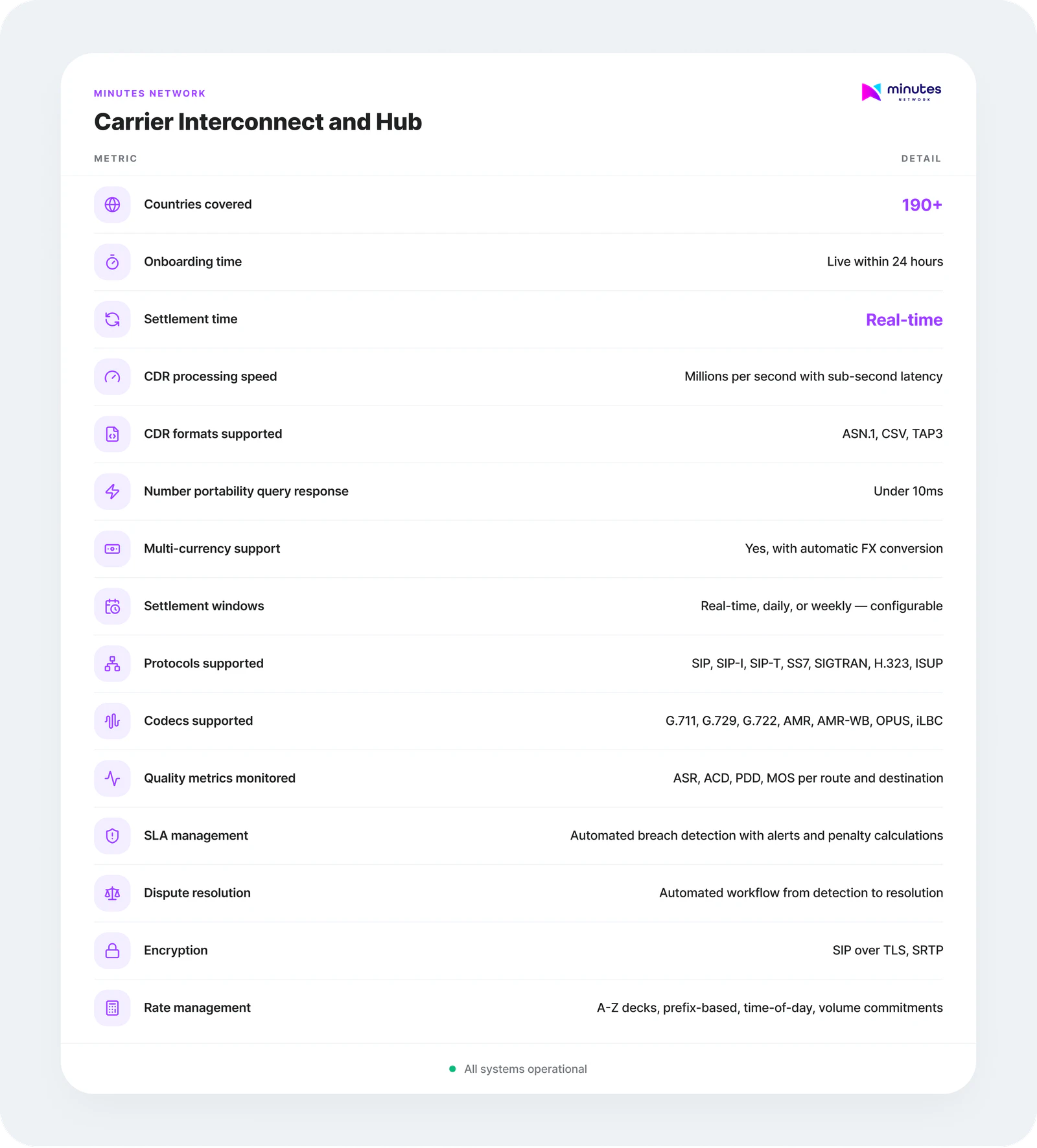 Real-time CDR hashing and mutual verification between counterparties. Automated payment execution on verified delivery. Immutable audit trails dramatically reducing billing disputes. Multi-currency support with automatic FX conversion. Configurable settlement windows: real-time, daily, or weekly.
