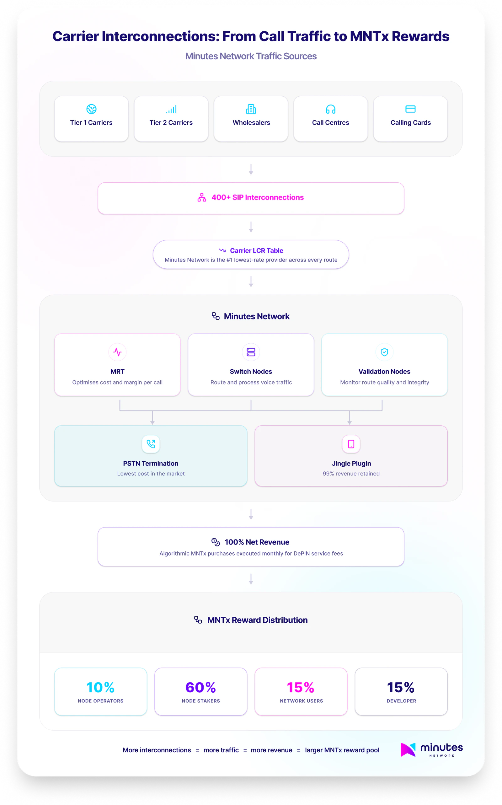 Carrier interconnection is the commercial and technical foundation on which Minutes Network's entire revenue model is built. Without interconnections, there is no inbound traffic. Without traffic, there is no revenue. Without revenue, there are no MNTx purchases and no rewards. Every other layer of the ecosystem depends on the network's ability to win and process voice traffic from international carriers.