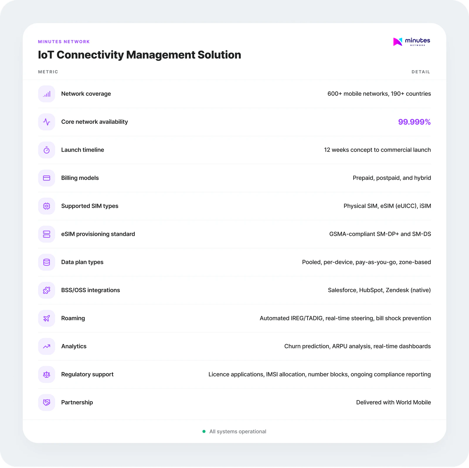 Full MVNO stack, BSS/OSS suite, and eSIM management platform — everything needed to launch a mobile network or IoT connectivity platform in weeks. Delivered in partnership with World Mobile.