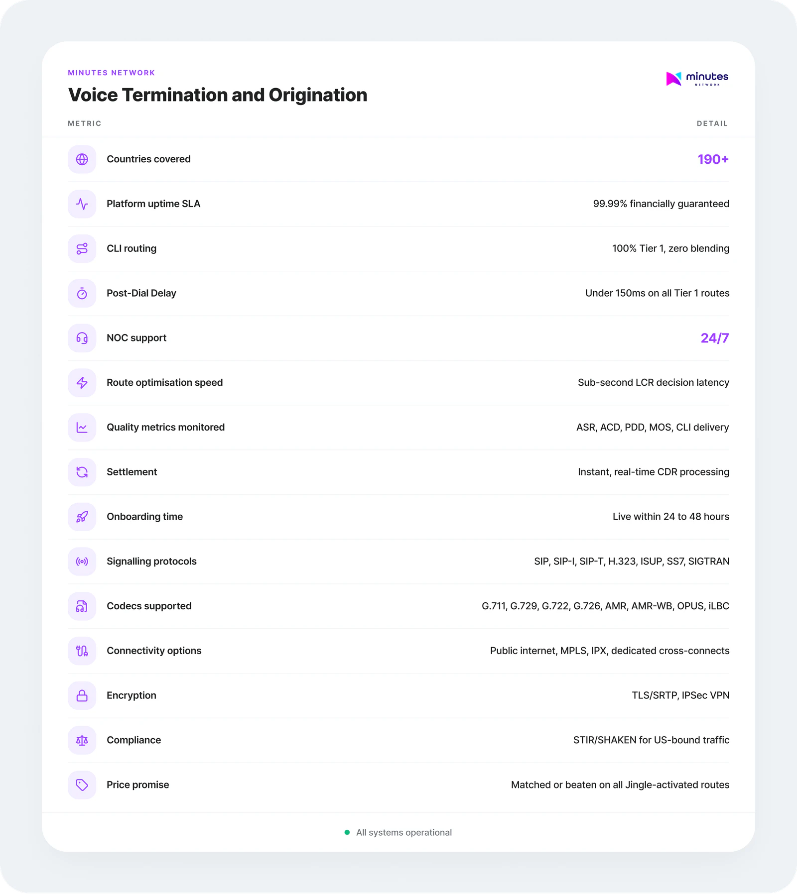 99.99% Platform Uptime (financially backed), <150ms Post-Dial Delay on all Tier 1 routes, 100% CLI Delivery guaranteed, 24/7 NOC Support.
