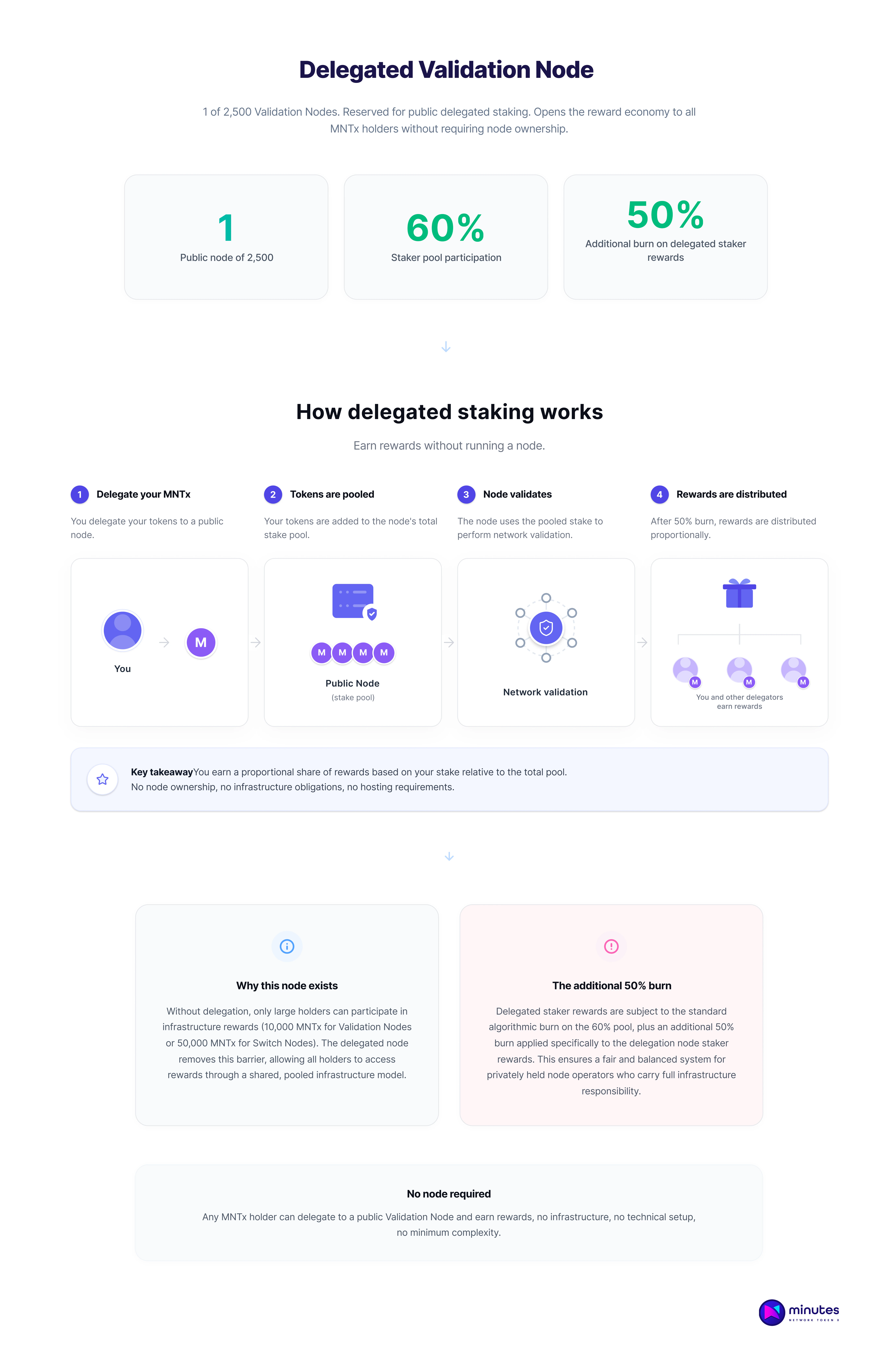 The delegated model works by pooling staked MNTx from multiple participants into a single operating node. Each participant earns a proportional share of the rewards generated by that node's validation activity, based on the size of their stake relative to the total pool after a 50% burn. This gives smaller holders access to the same reward mechanics that private node operators benefit from, without the requirement to acquire a full node or meet the infrastructure and hosting obligations that come with operating one directly.