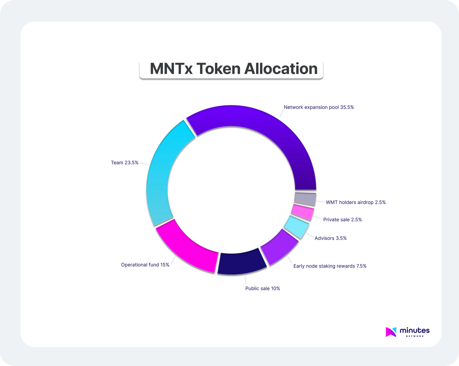 The total supply of MNTx is fixed at 500,000,000 tokens. No additional tokens can ever be minted. The allocation is structured to prioritise long-term network growth, with the largest single portion reserved for strategic expansion activities.