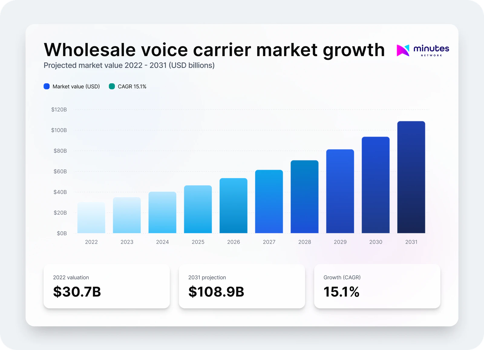 Minutes Network operates within the global paid-for voice calling market, which was projected to reach $251 billion in 2024. While the overall market shows a slight annual decline (CAGR of -2.74% through 2028), the wholesale voice carrier segment within it tells a different story. This subsegment was valued at $30.7 billion in 2022 and is projected to grow to $108.85 billion by 2031, driven by a CAGR of 15.1% as telecom providers increasingly shift from traditional data and voice services toward wholesale voice carrier services.