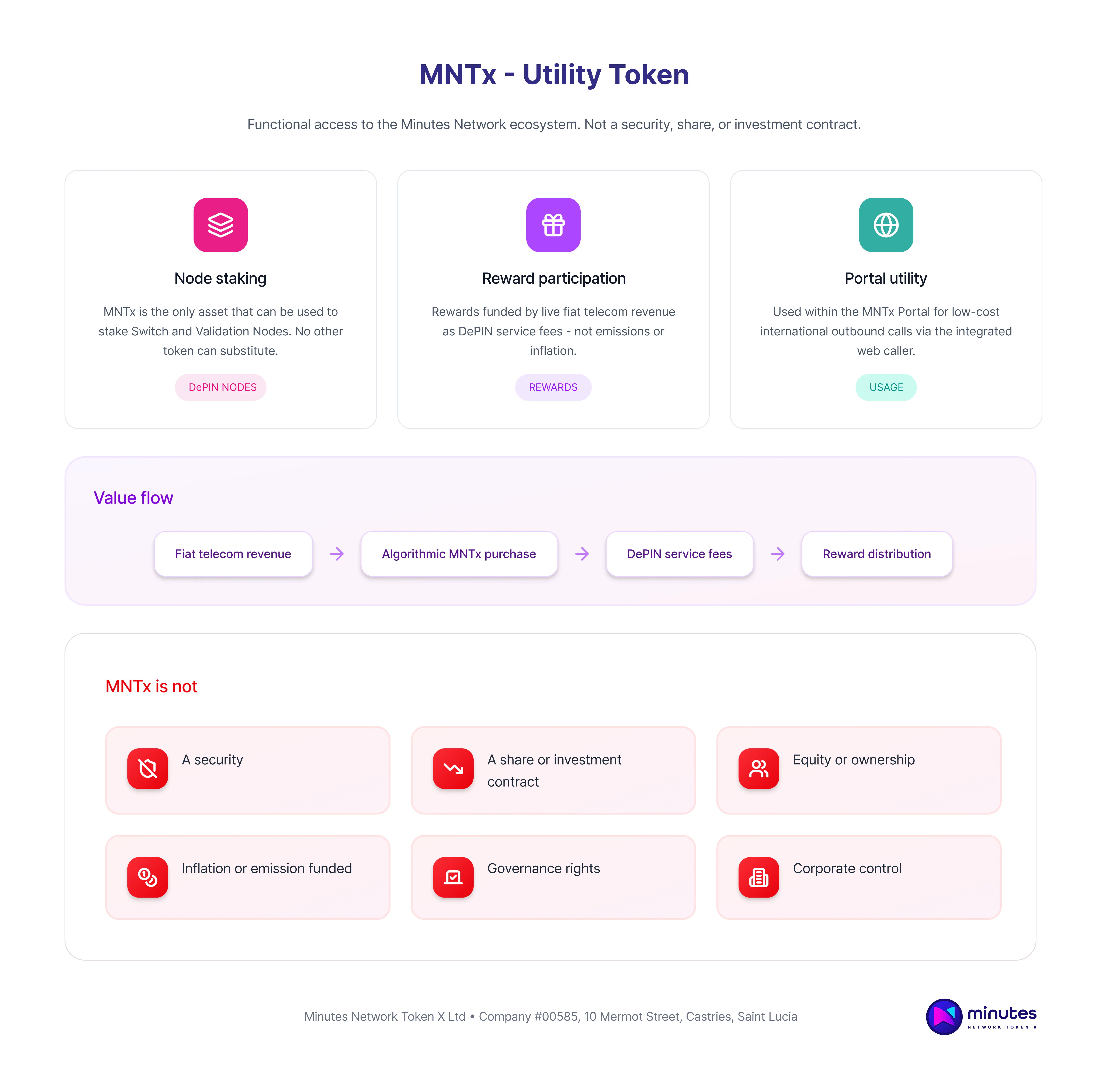 The token is classified as a utility token. Ownership provides access to ecosystem participation and reward mechanisms but does not confer equity, governance, or control rights in Minutes Network or its associated entities.