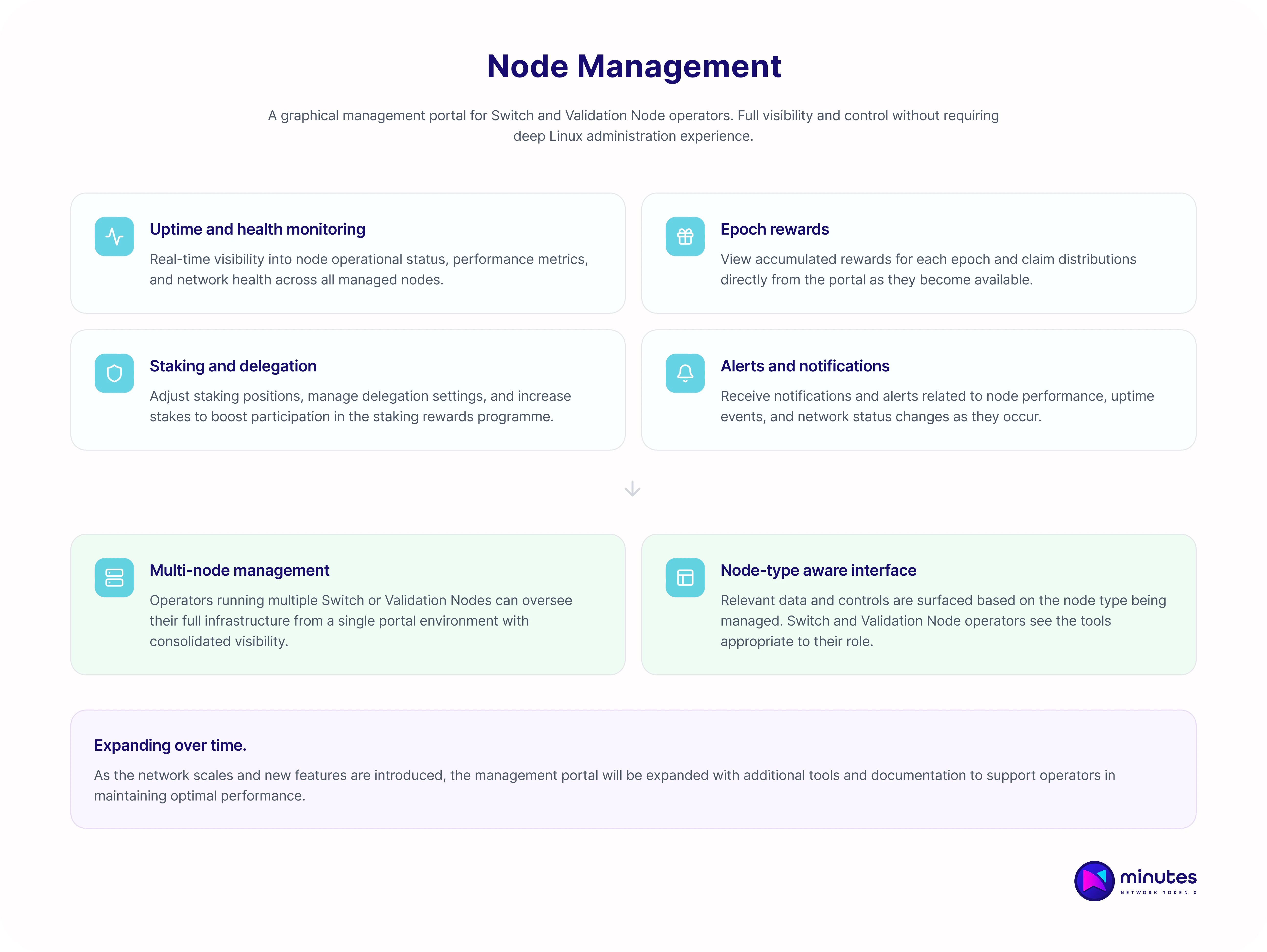 The portal is designed to serve both Switch Node and Validation Node operators, with relevant data and controls surfaced based on the node type being managed. Operators running multiple nodes can oversee their full infrastructure from a single environment.