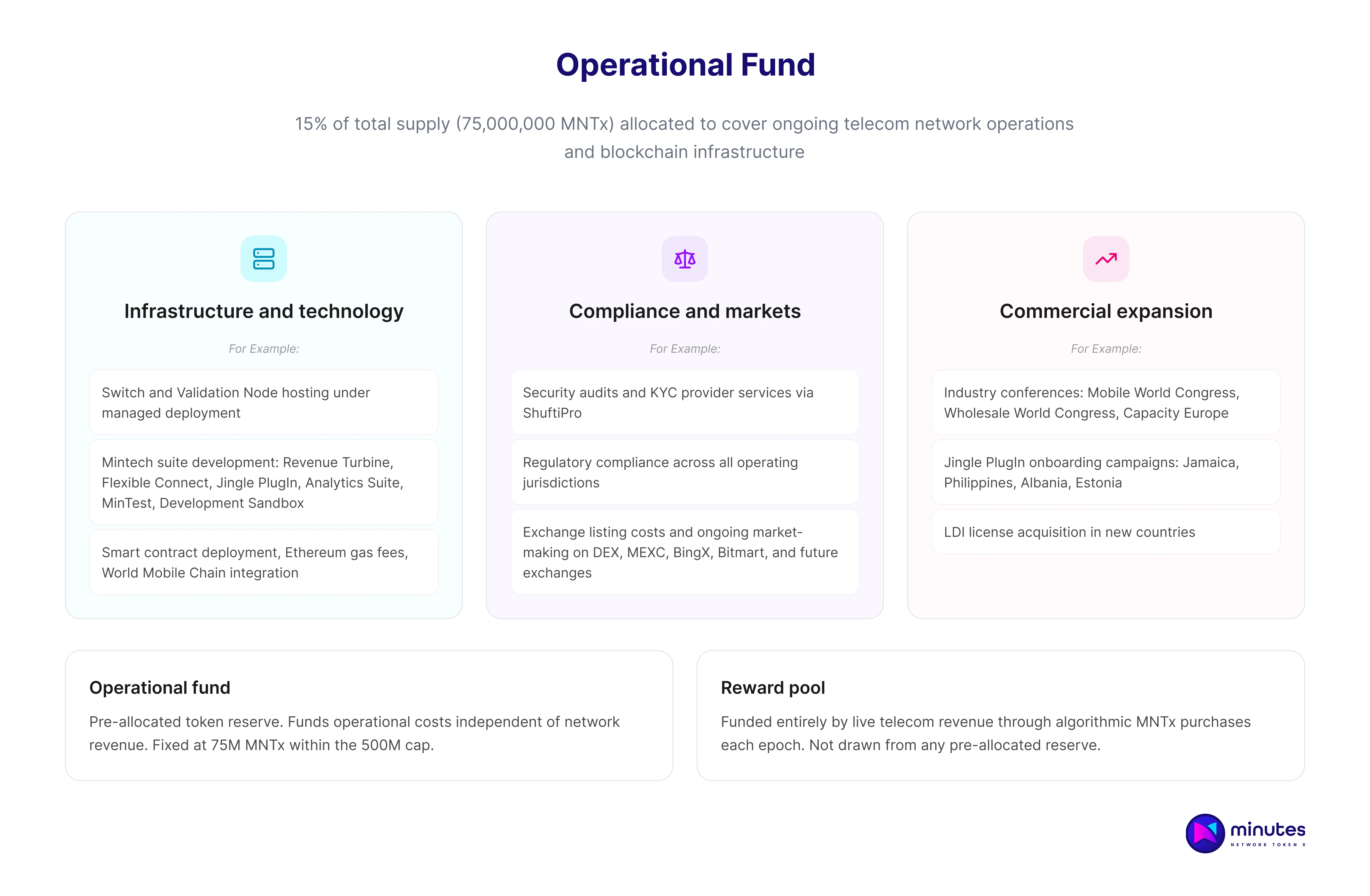 Unlike the reward pool, which is funded by telecom revenue through algorithmic MNTx purchases, the operational fund is a pre-allocated token reserve. It provides the ecosystem with the resources needed to scale operations without relying on external fundraising or dilutive token issuance beyond the fixed 500 million cap.